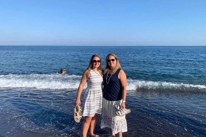 In Firostefani hielten wir für ein Foto an der berühmten blauen Kuppelkirche. Nikos erzählte vom Vulkan und wie die ganze Insel eigentlich eine riesige Caldera ist – er zeigte auf die Felsen, wo man alte Lavaschichten sehen konnte. Plötzlich frischte der Wind auf und mein Hut flog fast in jemandes Frappe. Danach schlug er Perissa Beach vor, ganz anders als alles bisher. Der schwarze Sand war heiß unter den nackten Füßen – fast wie auf verbranntem Toast (ob das ein Verkaufsargument ist, weiß ich nicht, aber es stimmt). Ein Hund schlief schattig unter einem Tavernen-Tisch; niemand störte sich daran.