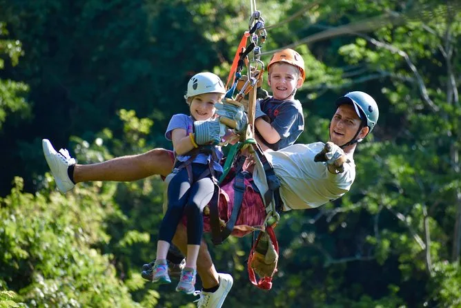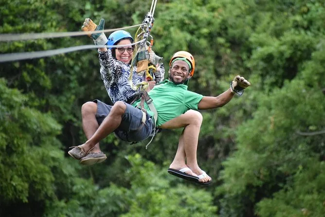 Die gesamte Zip 'n' Dip Canopy Tour erstreckt sich über rund 3 Kilometer – fast zwei Meilen Seile, die durch die Baumkronen gespannt sind. Manche Plattformen liegen nah beieinander, bei anderen hält man kurz inne und schaut auf das wilde Geflecht aus Lianen und Ästen unter einem. Einmal rief ein Kind hinter mir: „Schneller!“ – ehrlich gesagt, ich habe es versucht, drehte mich aber meistens in der Luft und erhaschte nur kleine Blicke auf den blauen Himmel zwischen den Ästen. Mein Lieblingsmoment? Der Geruch überall – feuchte Erde, eine blumige Note, die ich nicht einordnen konnte, und Sonnencreme aus einem Rucksack. Verrückt, was einem so im Gedächtnis bleibt.
