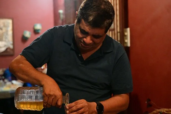 Du betrittst knarrende Türen zu einem 150 Jahre alten indo-portugiesischen Haus im Fontainhas Viertel von Goa für eine intime Weinverkostung mit Herrn Aires Andrade. Probiere einzigartige Goan Weine mit hausgemachten Snacks, lausche Familiengeschichten und spüre den langsamen Rhythmus des Erbes um dich herum. Hier geht es weniger ums Weintrinken, sondern mehr darum, lebendige Geschichte für einen unvergesslichen Nachmittag zu erleben.