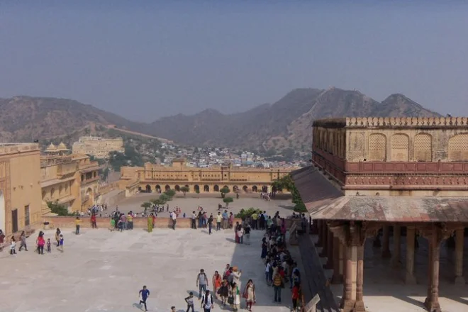 Schon früh morgens trafen wir unseren Fahrer direkt am Hoteleingang – er wartete mit einer kühlen Wasserflasche und einem freundlichen Lächeln. Die Luft war warm, aber noch angenehm, und der Verkehr begann gerade erst zuzunehmen, als wir zum Amber Fort aufbrachen. Unser Guide erzählte spannende Geschichten über die alten Rajputen-Könige und zeigte auf, wie die Sandsteinmauern im ersten Sonnenlicht fast zu leuchten schienen. Beim Aufstieg zum Hauptinnenhof hörte ich irgendwo hinter den Mauern das Rufen von Pfauen. Von dort oben bekommt man richtig ein Gefühl dafür, wie die Herrscher einst über ihr Reich wachten – und eine frische Brise sorgt für Erholung nach dem Aufstieg.