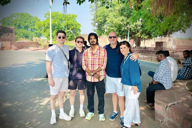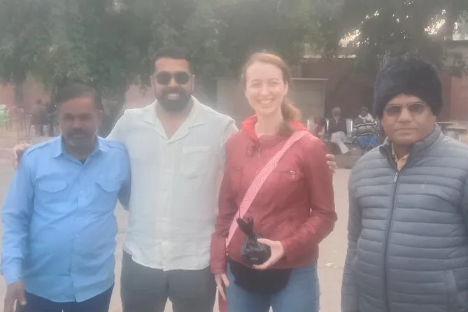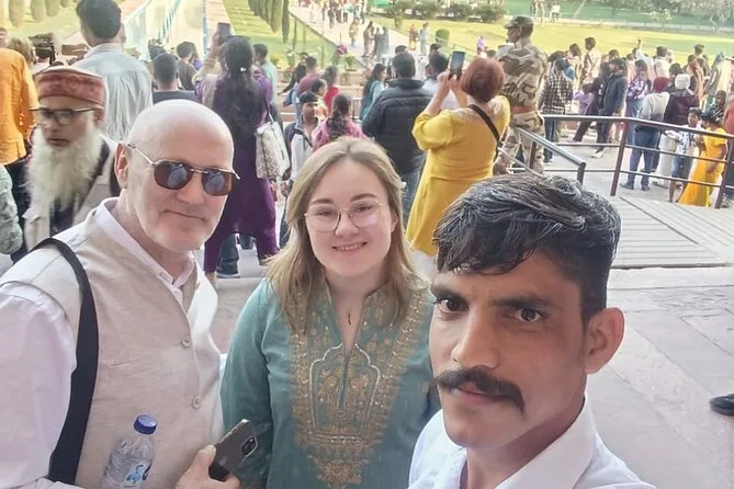 Das Taj Mahal ist so ein Ort, von dem man glaubt, man kennt ihn aus Fotos. Aber dort zu stehen, wenn die Morgensonne das Marmor von Blau-Grau zu Gold verwandelt… das lässt sich kaum in Worte fassen. Sanjay erzählte uns von Shah Jahan und seiner Frau – und zeigte sogar eine kleine Kalligraphie, die ich sonst übersehen hätte. Er bot an, Fotos von uns zu machen (ich hasse es normalerweise zu posieren, aber er hatte Tricks, damit es nicht peinlich wurde). Die Luft roch leicht nach nassem Gras und Räucherstäbchen. Ich erinnere mich, wie meine Schuhe auf dem Kies knirschten, während wir umhergingen; immer wieder berührte ich das kühle Marmor, um sicherzugehen, dass es echt war.