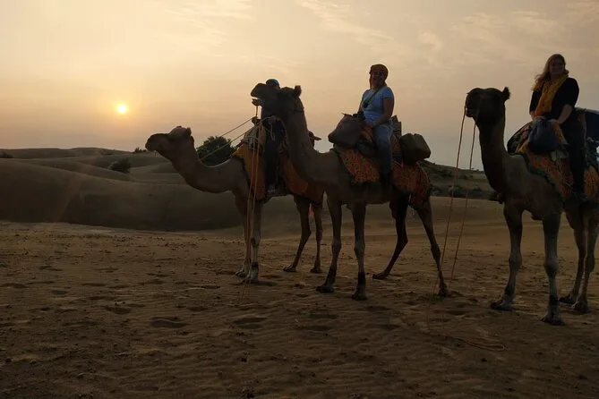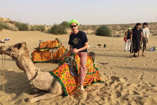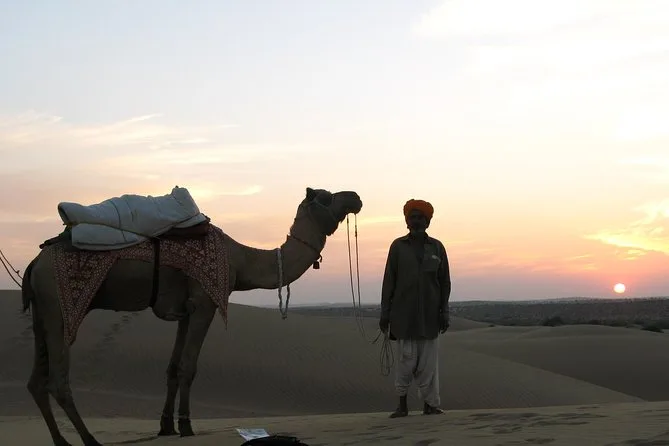 Erlebe Jaisalmers Wüste bei einer abendlichen Kamelsafari über goldene Dünen, genieße den Sonnenuntergang und entspanne bei lokaler Musik und einem Abendessen unter dem Sternenhimmel. Lache mit den Guides und koste Aromen, die du lange in Erinnerung behalten wirst.