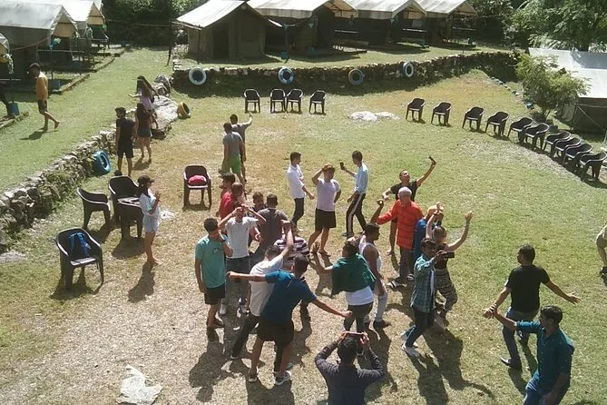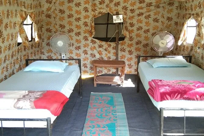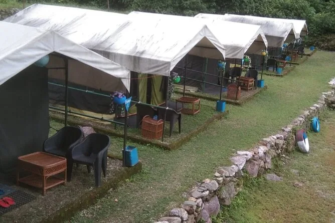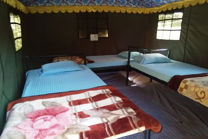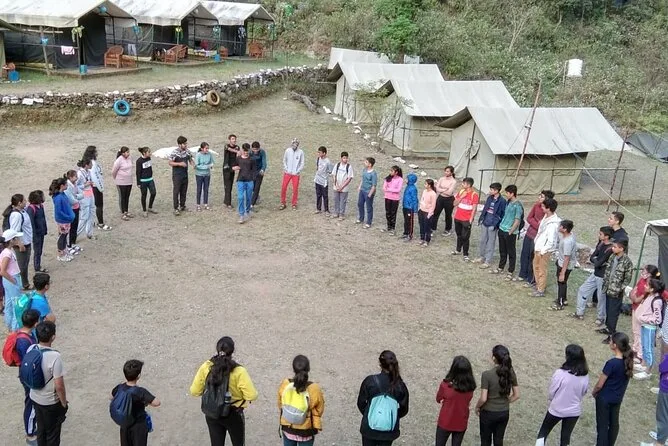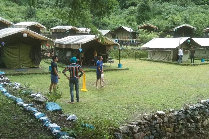 Im Preis sind alle Mahlzeiten enthalten – Frühstück, Mittagessen, Abendessen (vegetarisch und nicht-vegetarisch) sowie abendliche Snacks und Tee. Für alle gibt es Camp-Spiele wie Cricket und Volleyball. Der geführte Trek zum Wasserfall ist ebenfalls dabei. Eigene Anreise ist bitte selbst zu organisieren!