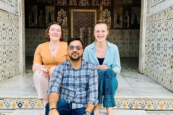 Unser Guide wartete direkt vor den Toren des Taj Mahal, genau als das erste zarte Rosa den Himmel färbte. Er erzählte uns Geschichten von Shah Jahan und Mumtaz – ehrlich gesagt kannte ich sie schon, aber vor Ort klangen sie ganz anders. Der Marmor fühlte sich kühl an, als ich ihn heimlich berührte, und um uns herum herrschte ein leises Summen von anderen Frühaufstehern. Unser Guide zeigte uns, wie sich die Farben mit der Sonne verändern – er hatte Recht, das Taj Mahal sieht wirklich alle paar Minuten anders aus. Ich versuchte ein Foto zu machen, blieb dann aber lieber einfach stehen und schaute.