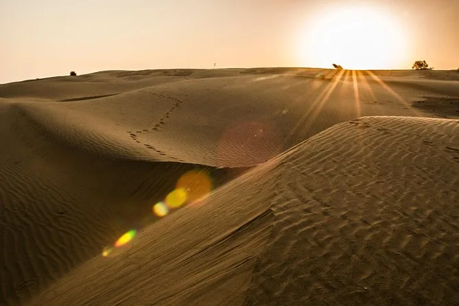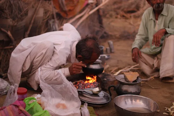 Am späten Nachmittag erreichten wir eine unberührte Dünenlandschaft – keine Menschenmassen, keine Händler. Nur wir, die Kamele und endlose goldene Sandwellen. Die Sonne sank langsam und tauchte alles in ein warmes Gold-Orange; die Temperatur sank merklich, als der Abend kam. Unsere Guides schlugen das Camp direkt im Sand auf. Das Abendessen wurde über offenem Feuer zubereitet – einfaches Dal und Chapati, aber es schmeckte besser als jedes Restaurantessen in der Stadt. Wir saßen zusammen, erzählten Geschichten und tranken süßen Chai unter einem Himmel voller Sterne (ehrlich, so viele hatte ich noch nie gesehen). Am Morgen erwachte ich in völliger Stille, nur das entfernte Läuten von Kamelglöckchen und der Duft von starkem Kaffee, der über glühender Kohle gekocht wurde.