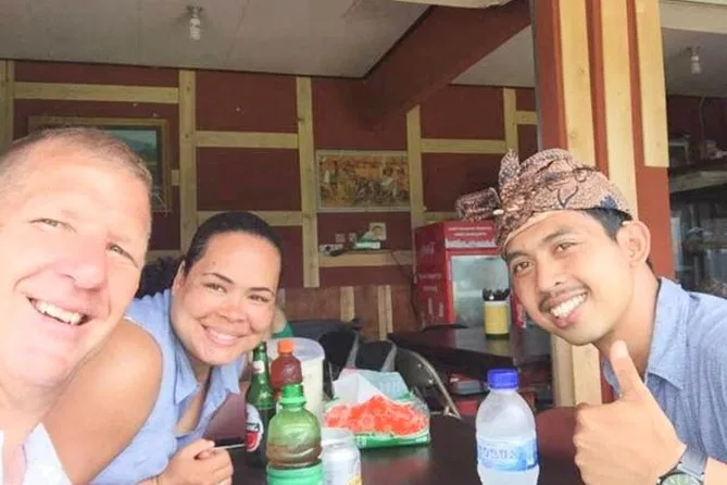 Mit dem Mittagessen hatte ich nicht gerechnet, aber nach dem Schwimmen war ich richtig hungrig. Es gab Nasi Goreng mit knusprigen Crackern und süßen Tee mit einem Hauch von Jasmin. Neben uns war eine Familie, deren Kinder immer wieder mit Muscheln zurückkamen, die sie gefunden hatten; ihr Lachen hallte irgendwie zwischen den Felsen wider. Wenn du den Wasserfall als Zusatz buchst (wir haben es gemacht), bringt dich Ketut über kurvige Straßen zum Kanto Lampo – kalter Sprühnebel im Gesicht, glitschige Steine unter den Füßen und das tiefe Rauschen des Wassers, das alle irgendwie leiser sprechen ließ.