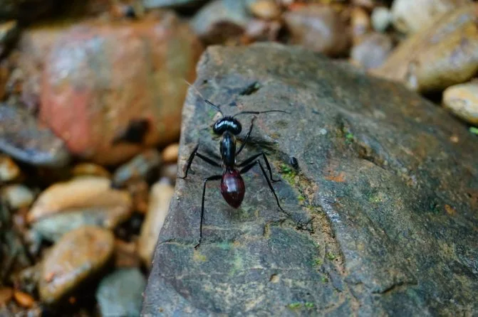 Am Nachmittag erreichten wir das Camp an einer Flussbiegung. Das Wasser war eiskalt und ließ dich kurz schlucken, aber nach dem ganzen Schwitzen genau richtig. Das Abendessen kochten wir am Lagerfeuer – Nudeln mit Gemüse und irgendwas Scharfes, das mich husten ließ und alle zum Lachen brachte. Abends saßen wir zusammen, sahen den Funken zu, wie sie in einen Himmel voller Sterne stiegen, der fast unwirklich wirkte. Jemand spielte leise Musik auf dem Handy, ich schlief ein mit dem Quaken der Frösche und dem entfernten Affengebrüll. Am Morgen nach dem Frühstück blieb Zeit, unter einem Wasserfall zu baden oder einfach am Wasser zu sitzen und nichts zu tun (schwieriger als gedacht). Zurück ging’s auf großen Reifen, die wir den Fluss hinunter trieben – zweimal wäre ich fast gekentert, aber peinlich wurde es nicht ganz.