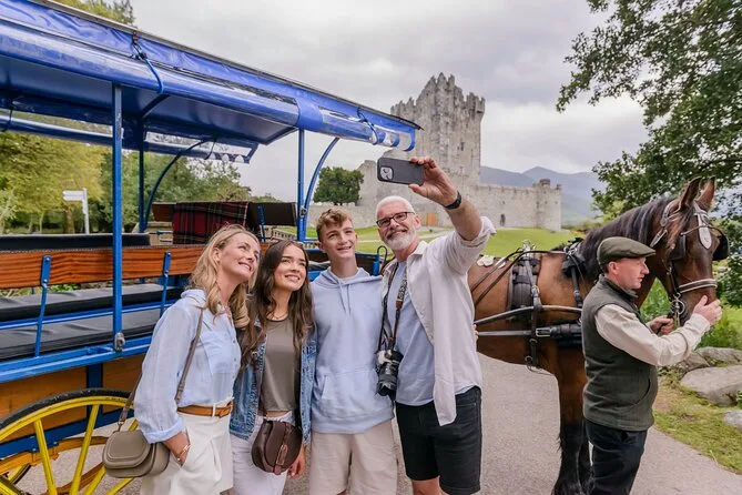 Erlebe eine Pferdekutschenfahrt von Killarney durch grüne Parklandschaft, vorbei an St. Mary’s Cathedral und Deenagh Lodge bis zum malerischen Ross Castle am Seeufer. Ein einheimischer Guide erzählt Legenden und sorgt für Lacher, während du den Duft von nassem Gras und entfernte Kirchenglocken genießt – mit genügend Zeit für Fotos oder stille Momente am Wasser.