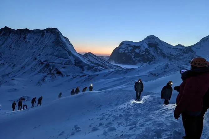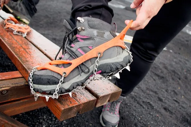Zieh warme Kleidung und feste Schuhe an; Steigeisen und Sicherheitsausrüstung stellt der Guide.