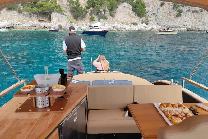 Ihr Tag umfasst die Abholung an den Anlegestellen von Positano, alle Hafen- und Steuern, Treibstoffkosten sowie die Nutzung von Strandtüchern und Schnorchelausrüstung auf komfortablen Booten mit WC und Dusche. Genießen Sie einen Aperitif mit Snacks und einen Brunch mit lokalen Spezialitäten, dazu Prosecco oder hausgemachten Limoncello, serviert vom Kapitän, bevor Sie am späten Nachmittag zurückkehren – ohne versteckte Kosten.