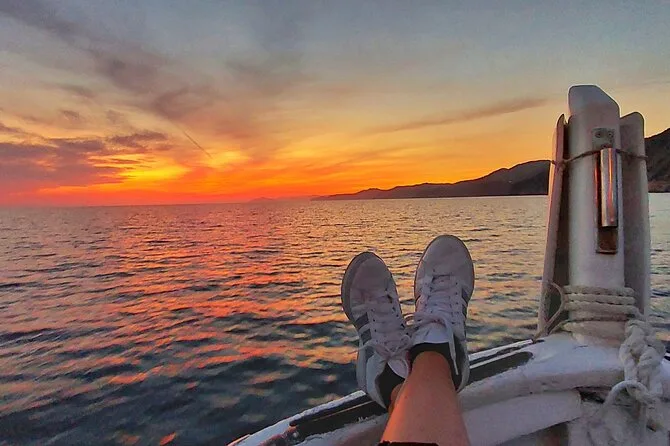 Dein Abend beginnt am Pier von Monterosso an Bord eines traditionellen ligurischen Gozzo mit einer kleinen Gruppe (bis zu 12 Personen). Strandtücher und Schnorchelausrüstung für die Badepause bei Manarola sind inklusive, ebenso Schwimmnudeln, falls gewünscht. An Bord gibt es einen italienischen Aperitivo mit regionalen Snacks und Prosecco oder Softdrinks, bevor ihr bei Sonnenuntergang an Punta Mesco zurückfahrt.