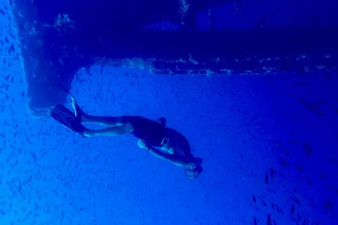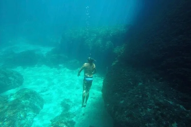 Der erste Halt war bei der Grotta Terradico. Mino verteilte Masken und Flossen an alle, die schwimmen wollten. Ich versuchte, nicht an die kalte Wassertemperatur zu denken (es war frisch – nennen wir es „belebend“). Ein Pärchen neben mir lachte, während sie versuchten, mit Schnorchel noch auf Selfie zu machen; ehrlich gesagt hätte ich das auch getan, wenn mein Handy nicht sicher in einer Drybag verstaut wäre. Beim Schweben im Wasser sah man kleine Fische um die Knöchel flitzen und hörte nur das eigene Atmen durch die Maske – eine seltsame Ruhe. Zurück an Bord fragte jemand nach der Kathedral-Grotte, und Mino erzählte eine Geschichte von Schmugglern, die dort früher versteckt waren. So erzählt, glaubte ich fast, er hätte einen von ihnen persönlich getroffen.
