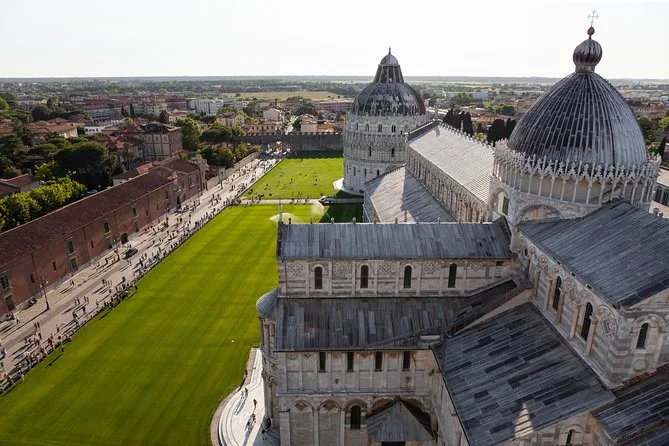 Pisa kam zum Schluss, gerade als das goldene Licht die berühmten weißen Steine auf der Piazza dei Miracoli traf. Der Schiefe Turm sieht in echt wirklich noch schiefer aus – fast so, als wolle er dich herausfordern, nicht zu lachen. Einige aus der Gruppe stiegen hinauf (ich habe nach den schwindelerregenden Treppen kapituliert). Stattdessen saß ich auf dem Gras, hörte Kinder spielen und sah zu, wie unsere Gruppe Fotos tauschte und Geschichten von den Stationen erzählte. Meine Füße waren müde, aber mein Kopf voll – auf eine gute Art.