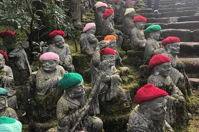 Im Daishoin-Tempel ist es plötzlich still – fast ungewohnt nach dem Trubel am Schrein. Wir drehen Gebetsmühlen (ob ich das richtig gemacht habe, weiß ich bis heute nicht) und hören Yuki zu, wie er von der Geschichte des Shingon-Buddhismus auf Miyajima erzählt. Die Statuen schauen so freundlich, manche tragen winzige rote Mützchen, die jemand liebevoll gestrickt hat. Einmal fällt das Sonnenlicht genau auf die moosbewachsenen Stufen – dieses grüne Leuchten habe ich immer noch vor Augen.