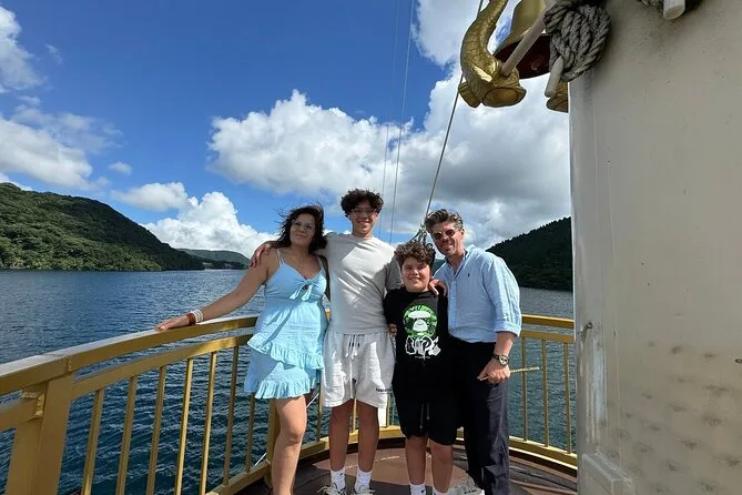 Nach all dem Trubel wirkte der Ashi-See fast unwirklich – stilles Wasser, diese seltsam fröhlichen Piratenschiffe, die am Steg schaukelten. Wir machten eine kurze Bootsfahrt; ich suchte immer wieder nach Fujis Spiegelbild, doch die Wolken versteckten ihn erneut. Am Hakone-Schrein standen Leute Schlange für Fotos am Torii, das mitten im See steht – Einheimische zeigten Peace-Zeichen, ein Brautpaar wirkte gleichzeitig nervös und glücklich. Ich berührte einen der alten Zedernbäume am Weg und dachte daran, wie viele Menschen das wohl schon vor mir getan haben.