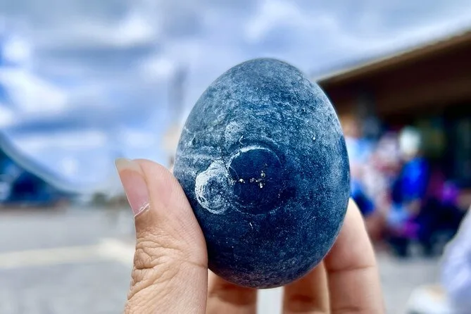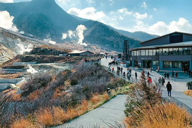 Als nächstes stand Owakudani auf dem Plan – man riecht es schon, bevor man es sieht. Überall Schwefelgeruch, Dampf zischt aus Erdspalten. Hiroshi reichte uns schwarze Eier (er nannte sie „onsen tamago“, aber diese waren tiefschwarz) und meinte, wer eins isst, bekommt ein paar Jahre extra geschenkt. Ich probierte eins; schmeckte wie ein Ei, nur irgendwie wärmer, vielleicht wegen der vulkanischen Hitze unter unseren Füßen. Die Seilbahn schwebte über Täler in herbstlichen Rot- und Gelbtönen (oder vielleicht tränten mir einfach die Augen vom Schwefel?).