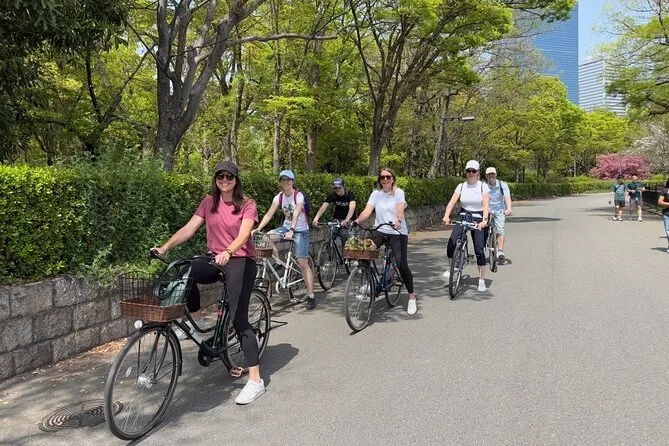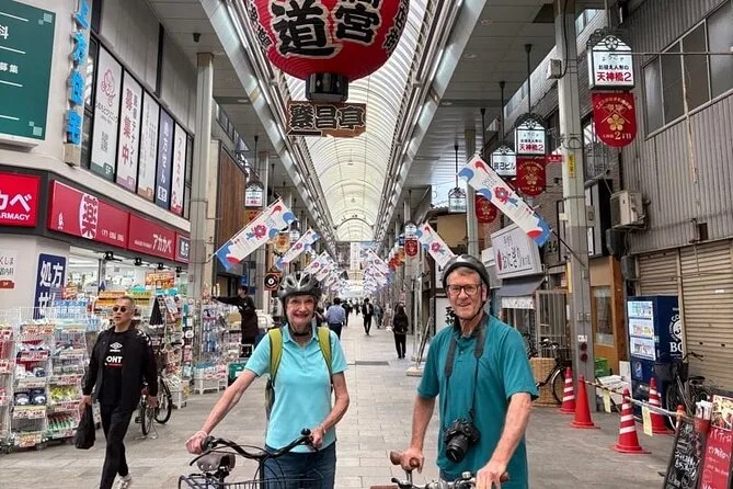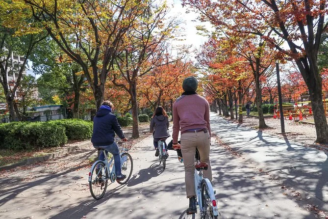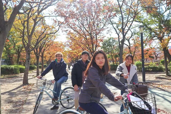 Die Tour umfasst fünf Stunden Radfahren mit einem lokalen Guide durch Osakas zentrale Viertel, inklusive Fahrradverleih, Fotos während der Fahrt, Eintritt zu wichtigen Sehenswürdigkeiten wie Schreinen und Museen, ein klassisches Okonomiyaki-Mittagessen (vegetarische Option mit möglicher Dashi-Brühe), sowie grünen Tee und Snacks – alles, bevor du flexibel zurückkehrst.