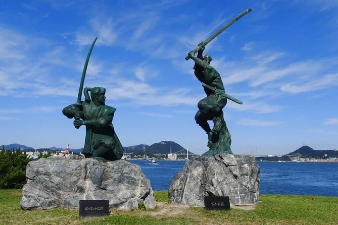 Wenn Sie Zeit für die Insel Ganryujima haben, ist sie nur eine kurze Bootsfahrt vom Karato-Hafen entfernt. Dort steht eine Statue, die an das berühmte Duell zwischen Musashi und Kojiro erinnert – unsere Führerin erzählte, dass bis heute diskutiert wird, wer wirklich gewonnen hat. Die Insel selbst ist ruhig, nur das Rufen der Seevögel und gelegentlich das Horn einer Fähre sind zu hören.