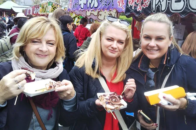 Mit der Yamanote-Linie fuhren wir ein paar Stationen – die Fahrt ist im Preis inklusive, was super praktisch ist – und landeten am Senso-ji Tempel in Asakusa. Die Nakamise-Straße zum Tempel war voller Stände mit Snacks. Ich probierte ein heißes Manju-Brötchen, das mir fast die Zunge verbrannte (aber es hat sich gelohnt). Emi erzählte die Geschichte der Tempel-Göttin, die immer wieder aus dem Fluss zurückkehrte – eine Art hartnäckiges Glückssymbol. Überall zündeten Einheimische Räucherstäbchen an, Touristen waren überall, doch wenn man lange genug stillstand, spürte man eine ganz besondere Ruhe.