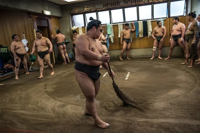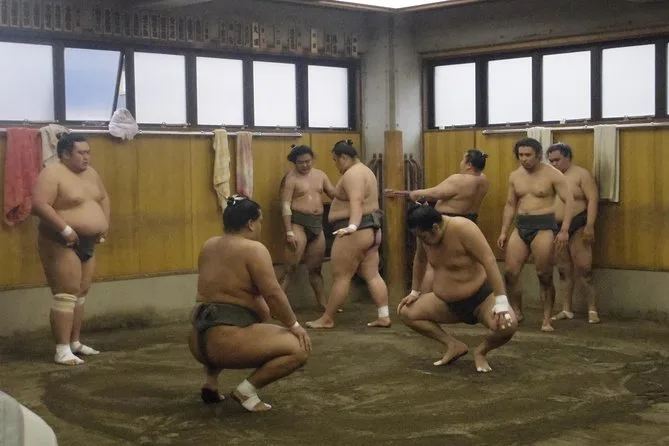 Dein Morgen beginnt mit dem Treffen deines lokalen Guides an einem nahegelegenen Bahnhof, von wo ihr gemeinsam zu einem authentischen Sumo-Stall in Tokyo geht. Die Eintrittskosten sind inklusive, sodass du das echte Sumo-Training aus nächster Nähe verfolgen kannst – mit ausführlichen Erklärungen zu Ritualen und Geschichte unterwegs. Wenn es zeitlich passt, hast du nach dem Training vielleicht sogar die Möglichkeit, draußen Fotos mit einigen Ringern zu machen, bevor ihr zusammen zurück zum Bahnhof geht.