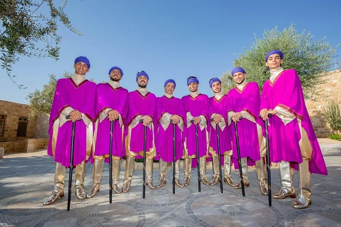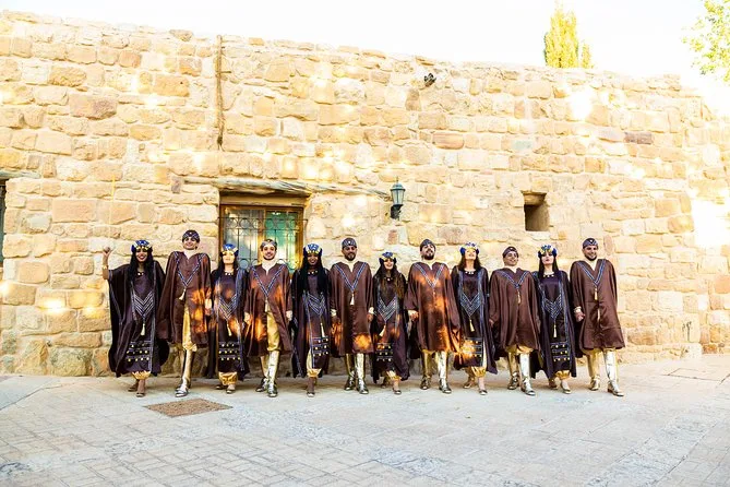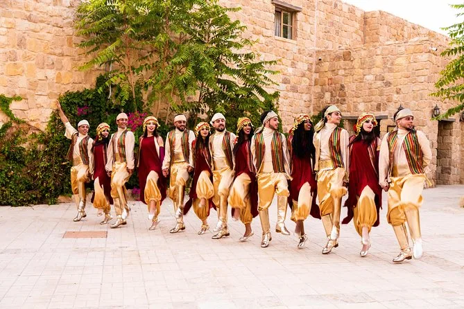 Dein Abend umfasst den Eintritt zur Folklore-Show mit über acht Live-Tänzen von lokalen Künstlern, interaktive Momente mit Musikern, frisch servierte traditionelle jordanische Desserts während der Pausen sowie unbegrenzten arabischen Kaffee – alles in einem barrierefreien Ambiente, in dem sich alle wohlfühlen können.