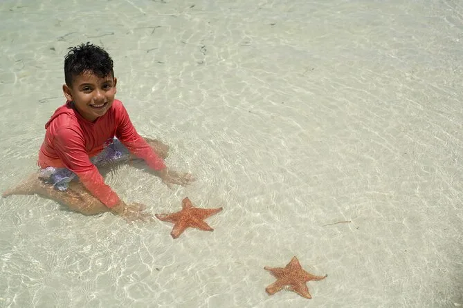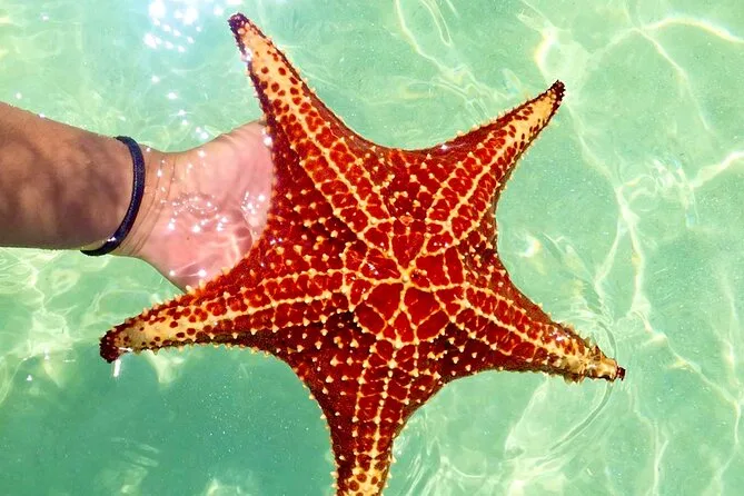 Zum Schluss geht’s zum Starfish Point. Das Wasser hier ist flach und warm – fast wie ein Bad – und leuchtend rot-orange Seesterne bedecken den Sand unter unseren Füßen. Marcus erinnert uns freundlich, sie nicht aus dem Wasser zu heben („Sie müssen dort unten atmen“, sagt er). Ein kleines Mädchen neben mir versucht, sie zu zählen, gibt aber nach zehn auf; ehrlich gesagt sind es einfach zu viele. Wir nippen an unseren Getränken aus der Kühlbox und treiben eine Weile einfach nur so. Noch jetzt denke ich daran, wie friedlich es sich genau in diesem Moment angefühlt hat.