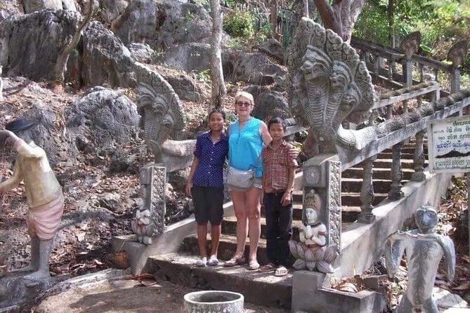 Danach rumpelten wir über schmale Straßen durch kleine Dörfer – Kinder riefen uns fröhlich zu – und hielten an der Höhle Phnom Chhngok. Sie ist halb von Ranken versteckt und innen angenehm kühl, der feuchte Stein fühlte sich unter den Fingern lebendig an. In der Höhle liegt ein winziger hinduistischer Tempel aus dem 7. Jahrhundert, und Dara erzählte uns Geschichten, während unsere Stimmen von den Wänden widerhallten. Ich hätte nicht gedacht, dass ich mich dort so klein fühlen würde.