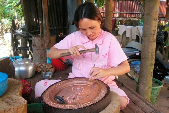 Als nächstes stand Koh Chen auf dem Programm. Die Insel ist berühmt für ihre Silberarbeiten, was ich vorher gar nicht wusste. Dara stellte uns einen Handwerker vor, der uns sogar ausprobieren ließ, ein Muster in eine Schale zu hämmern – meine sah aus, als hätte sie ein Erdbeben überstanden, aber er lachte nur und meinte, Übung macht den Meister. In der Werkstatt lag ein leichter Metallgeruch in der Luft, vermischt mit etwas Süßem vom Mittagessen, das irgendwo in der Nähe vorbereitet wurde. Durch das Dorf zu schlendern fühlte sich echt und ungekünstelt an; die Leute nickten oder lächelten, ohne uns aufdringlich zu beachten.
