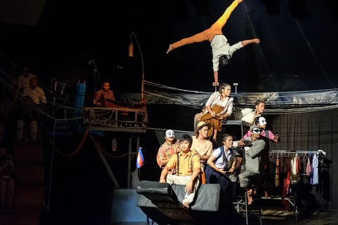 Setz dich unter das Zirkuszelt von Siem Reap und erlebe, wie lokale Künstler mit Akrobatik und Live-Musik echte kambodschanische Geschichten erzählen – mal lustig, mal tiefgründig. Mit Backstage-Zugang vor der Show triffst du die Artisten und siehst Kostüme aus nächster Nähe. Freu dich auf Lachen, Überraschungen und Momente, die lange nachklingen.