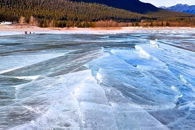Am Bow Lake war es viel ruhiger als erwartet. Man hörte den Wind übers Eis streichen und ab und zu einen Raben, der einfach so in die Luft schrie. Mei hat heißen Tee verteilt (Kaffee gab’s auch, aber ich hab mich für Tee entschieden) und wir standen einfach da und sahen zu, wie das Licht über die Berge wanderte. Am Abraham Lake selbst sind die berühmten Eisblasen aus der Nähe noch viel faszinierender – manche so groß wie eine Faust, andere winzig wie Perlen. Es ist fast hypnotisch, durch das blaue Eis nach unten zu schauen. Ich habe bestimmt hundert Fotos gemacht, aber keines fängt das Gefühl wirklich ein.