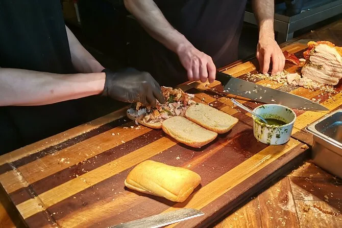 Die Tour umfasst sechs verschiedene Verkostungen: Sushi, Schokolade, Scotch Eggs, Tacos, Dessert-Riegel, Schweinefleisch-Sandwiches und ein geheimes Gericht.