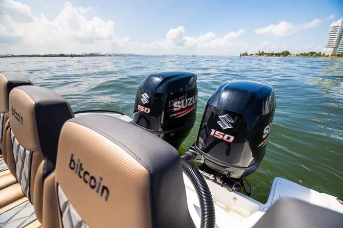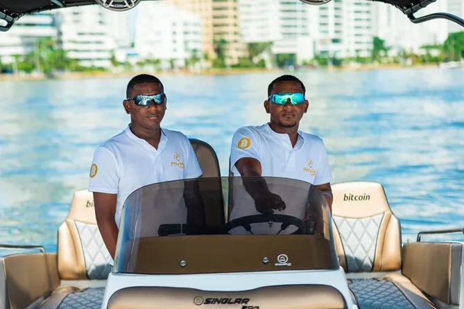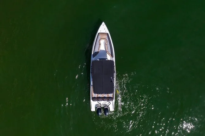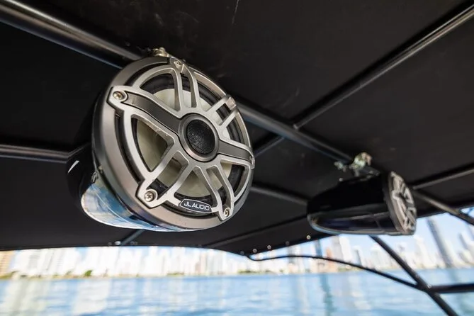 Das Boot verfügt über hochwertige Ledersitze, ein JL-Bluetooth-Audiosystem, ein Sonnenbett für zwei Personen, eine Frischwasserdusche, Schwimmhilfen und eine große Kühlbox mit 10 kg Eis.