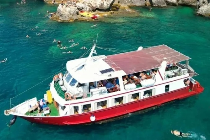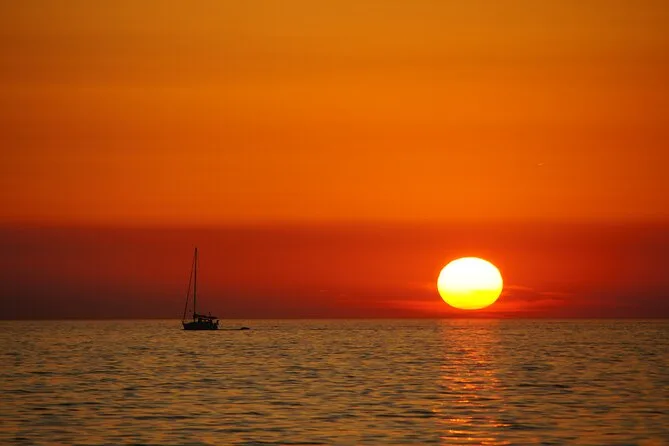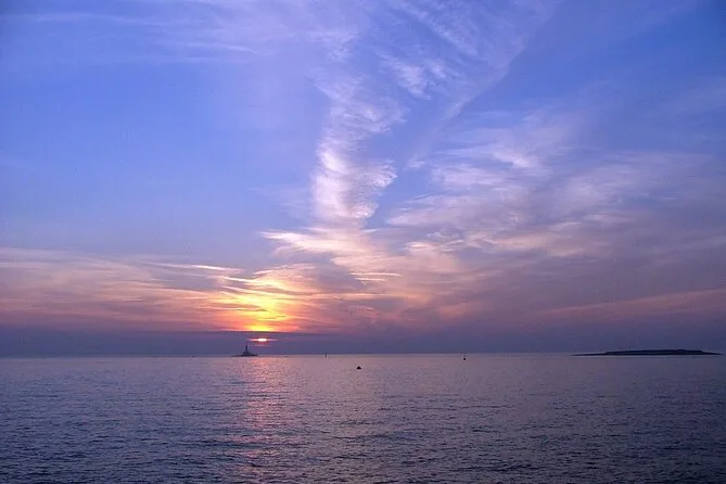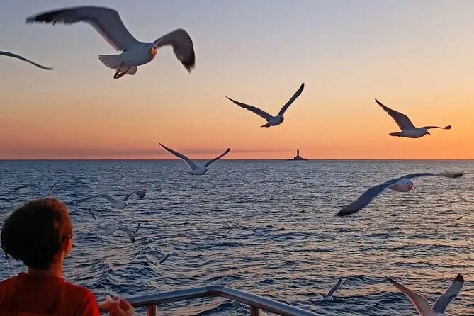 Steig in Medulin zu für eine Abendfahrt auf der Suche nach Delfinen rund um Kamenjak und den Leuchtturm Porer. Genieße ein Abendessen an Deck – Fisch, Fleisch oder vegetarisch – mit Getränken, während Musik spielt und der Sonnenuntergang die Farben wechselt. Es ist ein stilles Erlebnis, Delfine in ihrer Welt zu sehen, während du im Abendlicht zurückgleitest.