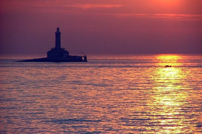 Plötzlich rief jemand „Delfine!“ und alle stürmten auf eine Seite des Bootes (es neigte sich gerade so, dass man nervös lachen musste). Wir sahen sie – nicht zum Anfassen nah oder spektakulär, aber da waren sie, zu zweit, wie sie im Sonnenuntergang auftauchten. Für einen Moment vergaß ich mein Abendessen. Marko erzählte uns vom Leuchtturm Porer, den wir gerade passierten; der war schon zu k.u.k.-Zeiten ein wichtiger Wegweiser für Seefahrer. Er scherzte, wer blinzelt, verpasst ihn – und er hatte recht.