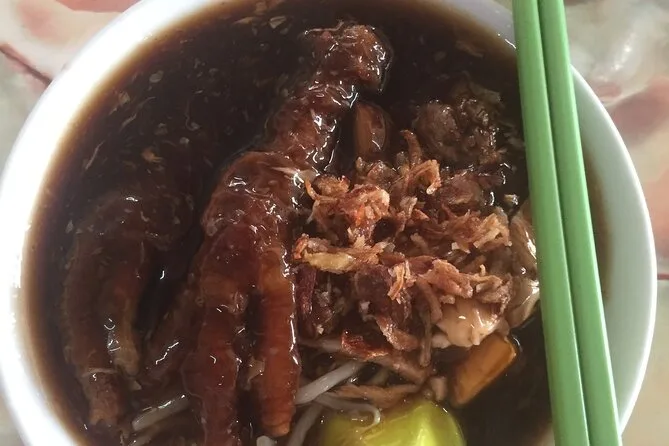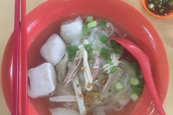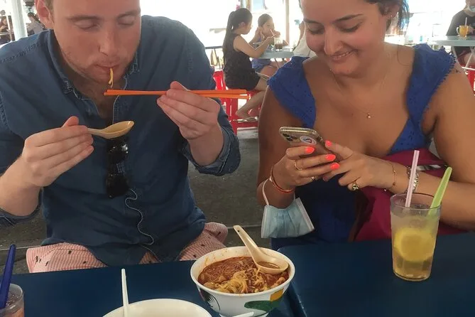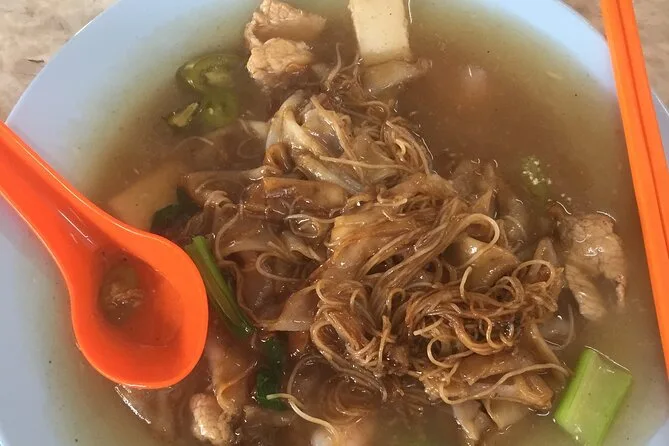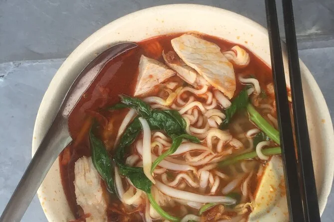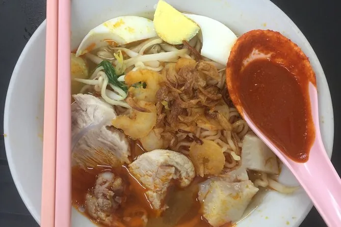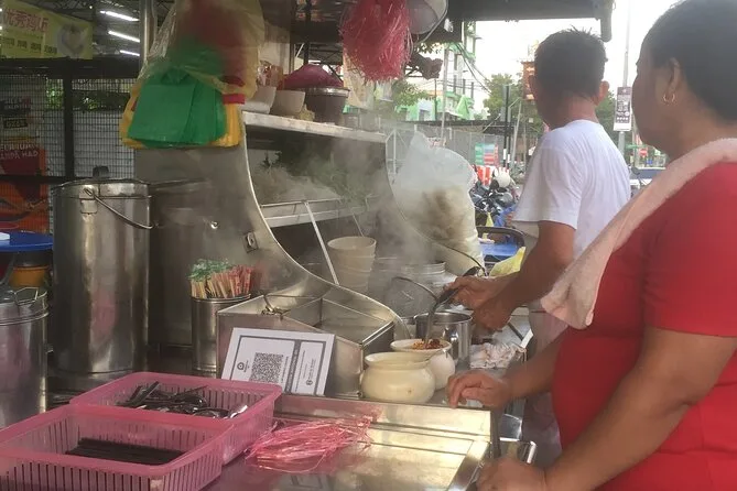 Du probierst Gerichte wie Lor Bak, Wantan Mee, Assam Laksa, Char Koay Teow, Hokkien Mee, Curry Mee sowie Desserts und Obst, wenn verfügbar.