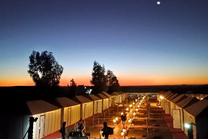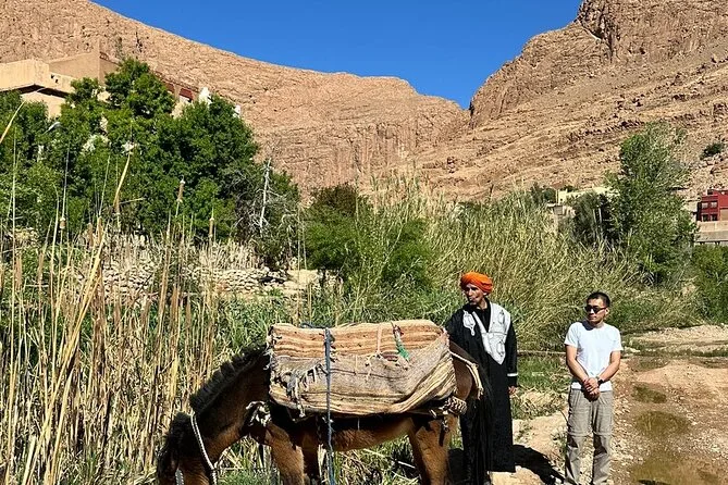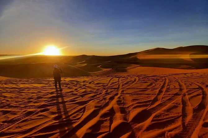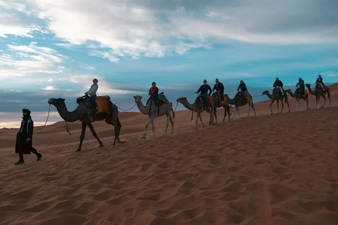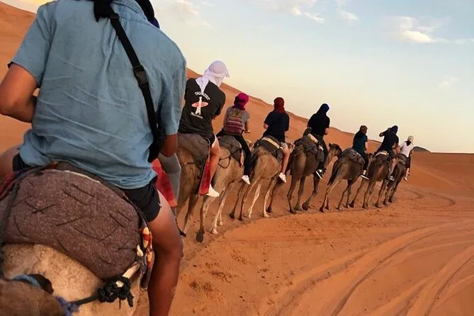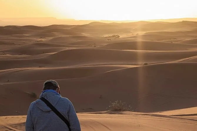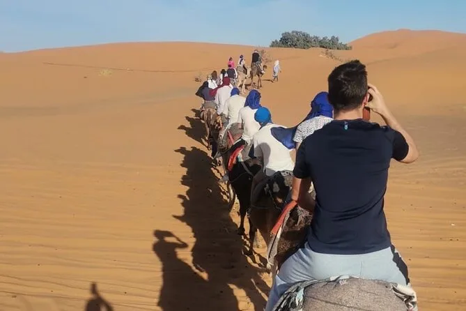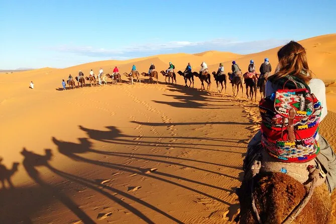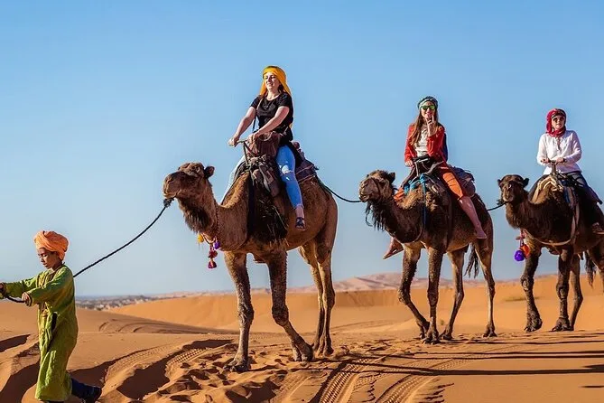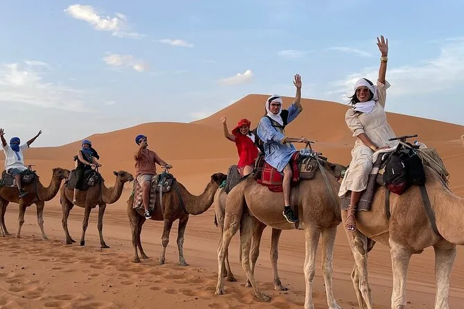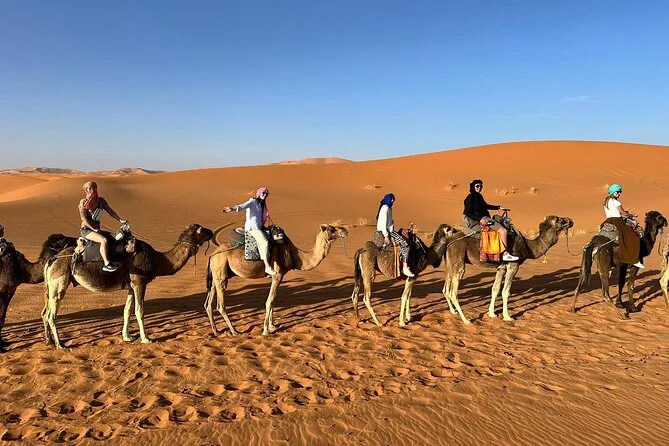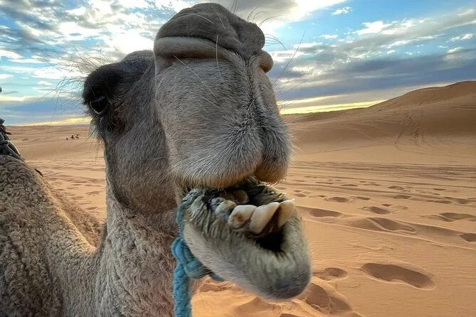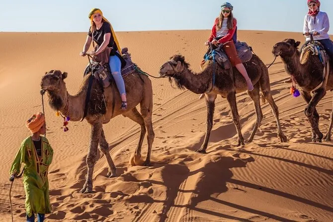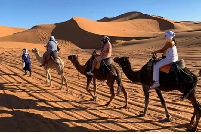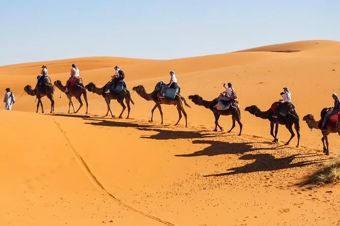 Deine Reise umfasst die Abholung in Fes, klimatisierten Transport durch Marokkos wechselnde Landschaften, geführte Touren mit Einheimischen durch Schluchten und Kasbahs, zwei Übernachtungen – eine im Wüstencamp in Merzouga (mit Sandboarding, wenn du magst), eine in einem komfortablen Hotel in Tinghir – sowie Kamelritte bei Sonnenuntergang und Sonnenaufgang durch die Erg Chebbi, bevor es weiter nach Marrakesch geht.