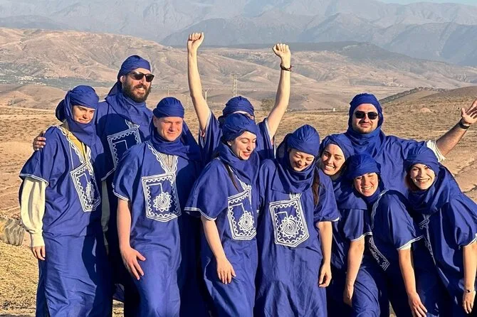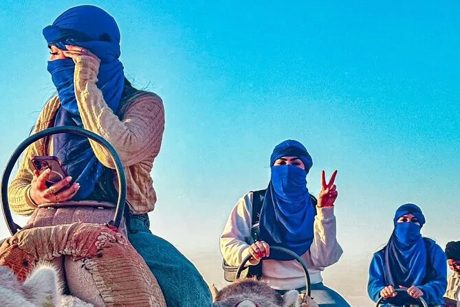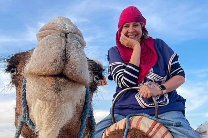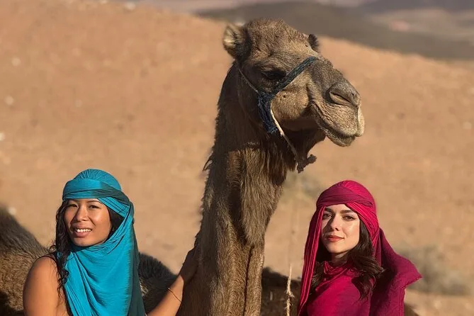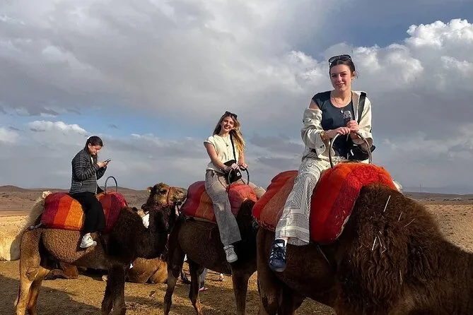 Der Ritt auf dem Kamel… na ja, ganz sanft ist das nicht (meine Oberschenkel erinnern sich noch), aber es hat etwas Beruhigendes, so langsam durch die steinigen Dünen zu gleiten und dabei jedes Detail wahrzunehmen. Die Luft kühlte schnell ab, als die Sonne unterging – irgendwo vorne hörte ich leise Trommeln. Youssef zeigte auf das Atlasgebirge in der Ferne, das fast wie gemalt wirkte. Als wir für Fotos anhielten, versuchte ich, mich auf Arabisch zu bedanken – Li lachte, weil ich’s total verhauen habe. Also, wenn du einen Ausflug von Marrakesch suchst, der mal richtig anders ist, dann ist das hier genau das Richtige.