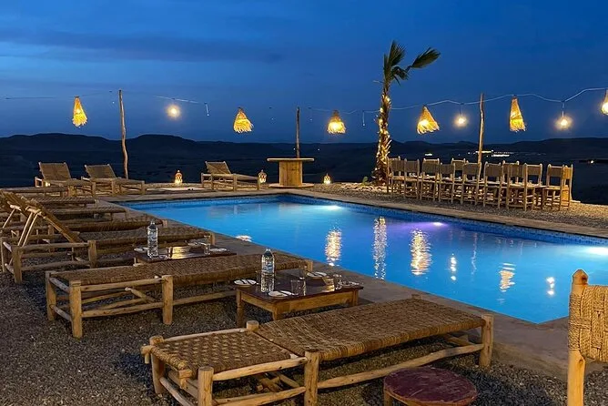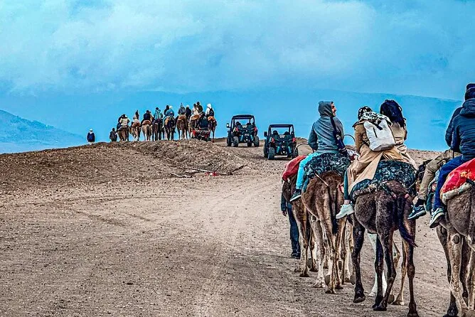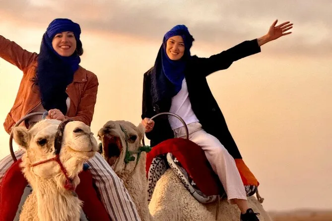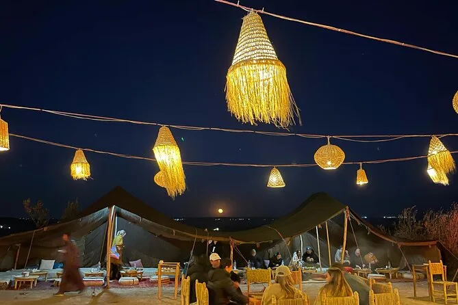 Dein Tag beginnt mit einer bequemen Abholung vom Hotel oder Riad in Marrakesch, gefolgt von einem Kamelritt bei Sonnenuntergang durch die steinigen Dünen der Agafay-Wüste mit Wasserflasche. Danach erwartet dich ein traditionelles marokkanisches Abendessen unter Wüstenzelten mit Live-Berbermusik und Lagerfeuer-Unterhaltung, bevor du am Abend zurück zu deiner Unterkunft gebracht wirst.