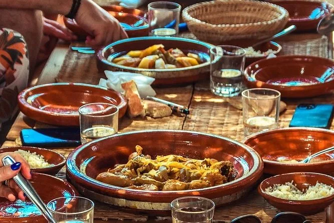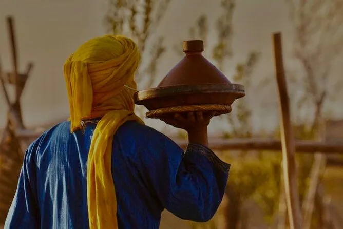 Serviert werden authentische marokkanische Gerichte wie Tajine, frische Salate und warmes Brot im Wüstencamp.