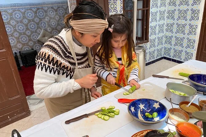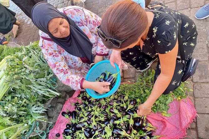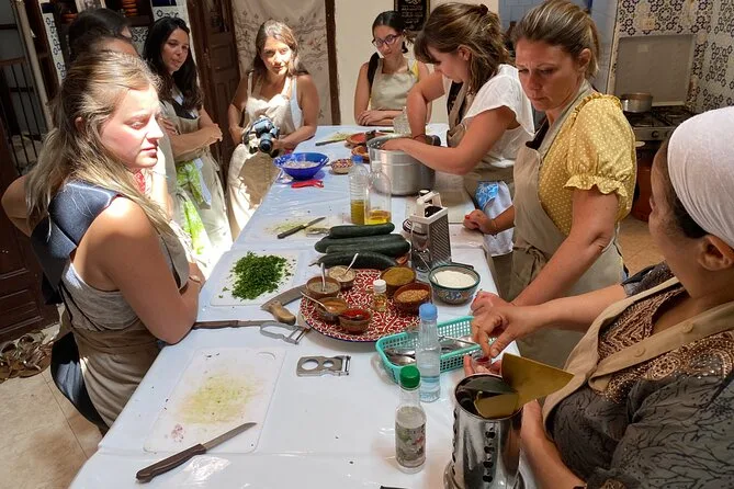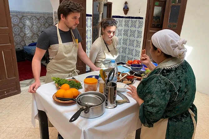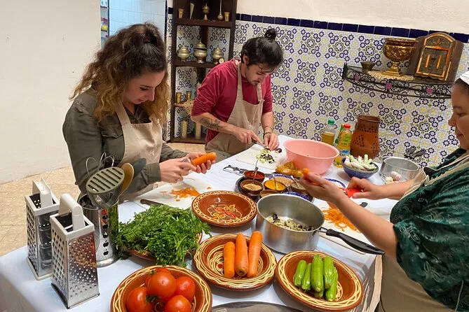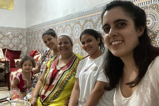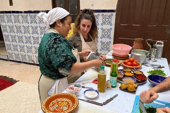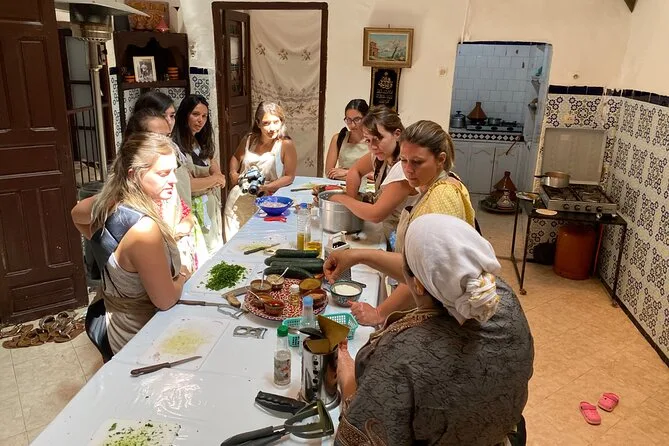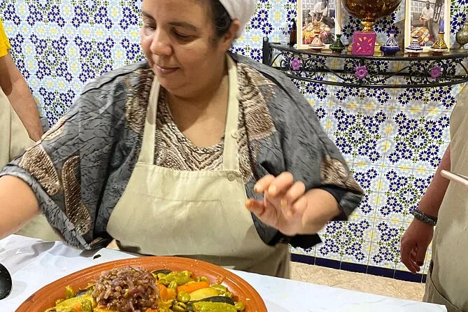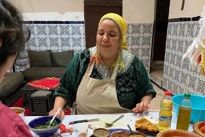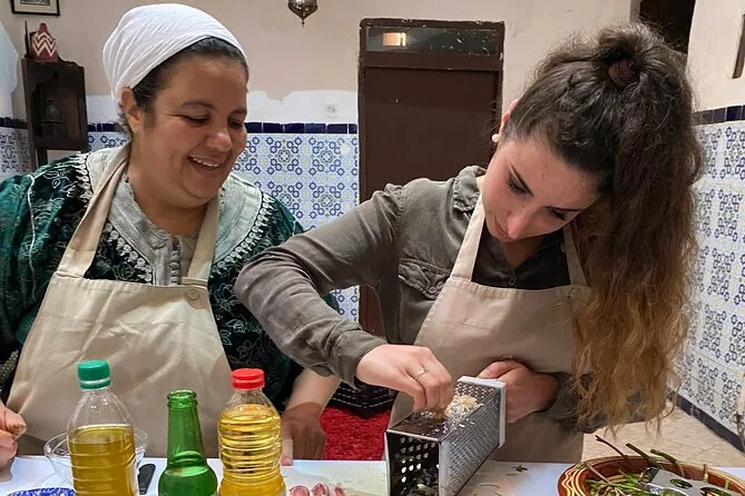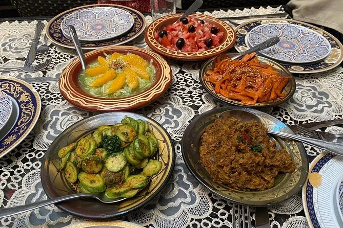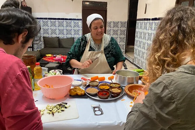 In ihrer Küche fühlte es sich an wie bei jemandem zu Hause – nicht wie in einem Kursraum. Überall bunte Fliesen, und ein niedriger Tisch war fürs Frühstück gedeckt. Laila zeigte uns, wie man Minztee „richtig“ einschenkt (ihre Worte) – hoch aus der Kanne, damit er schäumt. Sie lachte, als ich etwas auf die Tischdecke spritzte. Dann wurden die Hände schmutzig bei Zucchini Charmoula und karamellisierten Karotten; sie sorgte dafür, dass jeder jedes Gewürz probierte, bevor es in den Topf kam. Es hat etwas Besonderes, von jemandem zu lernen, der diese Gerichte seit Jahrzehnten kocht – während sie mit einer Hand eingelegte Zitronen schnitt, erzählte sie Geschichten aus ihren Zeiten im alten Gästehaus.