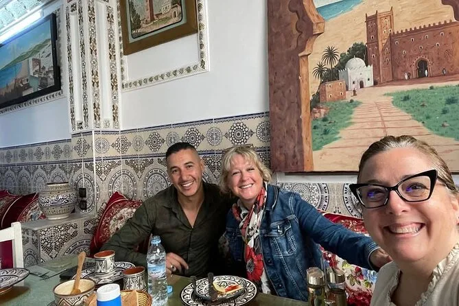 Später schlenderten wir durch die Kasbah, enge Gassen schlängelten sich zwischen weißen Wänden mit blauen Farbtupfern. Eine Frau, die Minze verkaufte, blieb stehen und unterhielt sich mit Nabil; sie stritten sich kurz über Fußballmannschaften, bevor sie mir einen Zweig zum Riechen reichte (ich kaufte tatsächlich etwas, obwohl ich es gar nicht brauchte). Das Mittagessen gab es irgendwo in der Medina – ein Platz voller Tische und Gerüche, die ich nicht benennen konnte, aber was immer ich aß, hatte Zimt und klebte an meinen Fingern. Nicht alles lief glatt; ich verlor unsere Gruppe für fünf Minuten in einem Souk-Stand voller Schals – aber außer mir schien das niemanden zu stören.