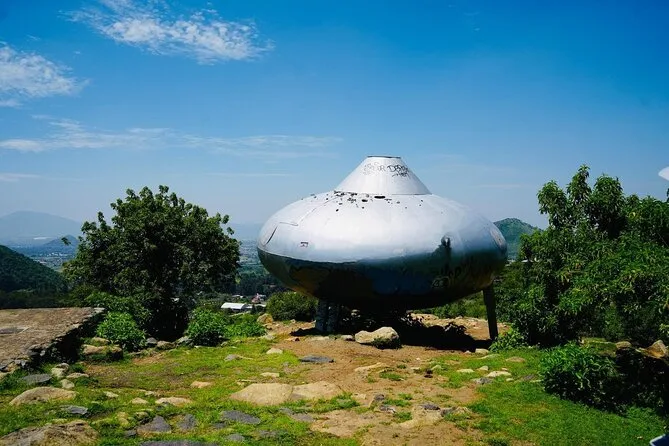 Du fährst durch offene Felder, Haingebiete, zwei Hügel mit Panorama und besuchst das UFO-Denkmal in Metepec.