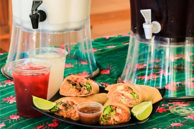 Ein herzhaftes Mittagessen mit Rind-, Schweine- und Hähnchen-Super-Burros sowie Softdrinks und Wasser ist inklusive.