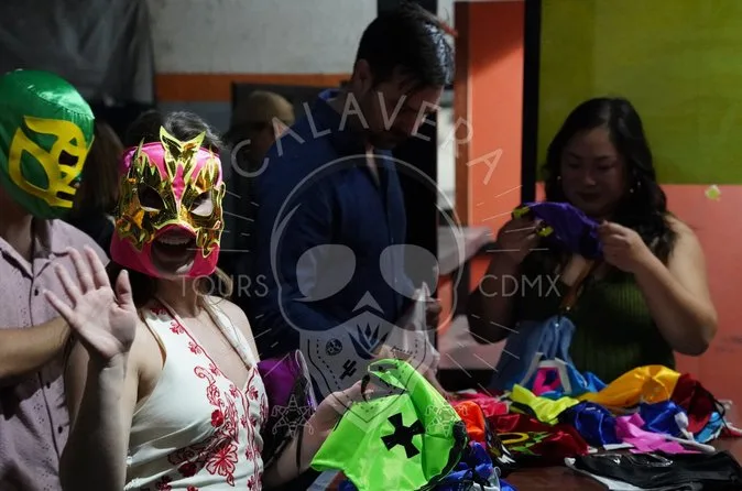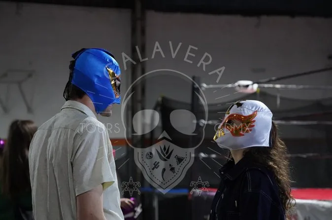 Dein Ticket beinhaltet eine Wrestlermaske, Abendessen (Tacos), einen Mezcal-Shot und den Eintritt zur Arena.