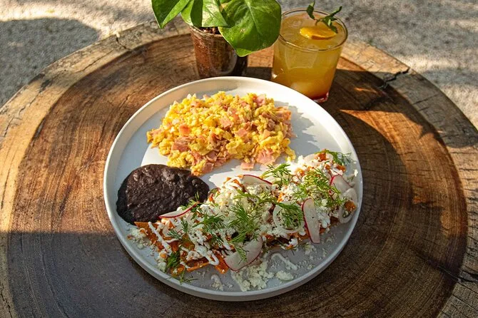 Das Frühstück umfasst zwei Eier nach Wunsch, regionale Chilaquiles, Bohnen, Kaffee oder Tee, saisonales Obst mit Bagel-Brot sowie ein erfrischendes Getränk.