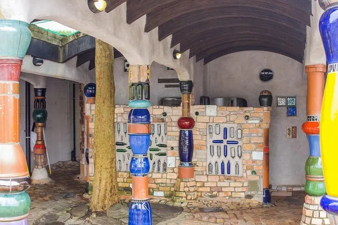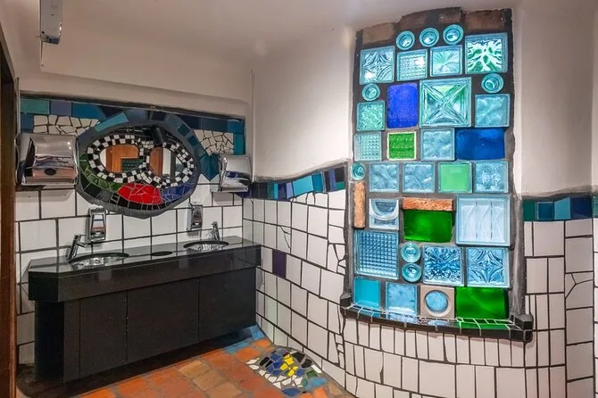 Danach fuhren wir ein kurzes Stück nach Kawakawa. Ich hatte schon von den Hundertwasser-Toiletten gehört, aber sie live zu sehen war… na ja, irgendwie urkomisch? Überall bunte Fliesen, absichtlich knallige Farben und sogar ein Baum, der durchs Dach wächst. Li musste lachen, als ich versuchte, „Hundertwasser“ richtig auszusprechen – ich hab’s wohl total verhauen. Einheimische kamen und gingen, als wäre es ein ganz normaler Dienstag, was mich zum Schmunzeln brachte. Verrückt, was normal wird, wenn man irgendwo lebt.
