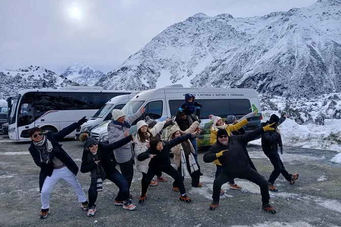 Dein Tag startet mit der Abholung vom Hotel in Queenstown, unterwegs gibt’s Wasser und Snacks. Du reist in einem kleinen Gruppenfahrzeug mit erfahrenem Guide, der spannende Geschichten und Schaf-Fakten teilt. In Mt Cook hast du viel freie Zeit zum Wandern oder Entspannen, bevor es abends zurückgeht – mit Stopps für lokale Spezialitäten, wenn du Hunger hast.