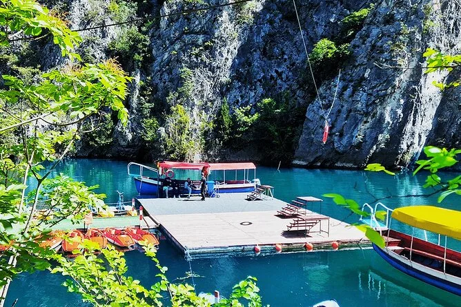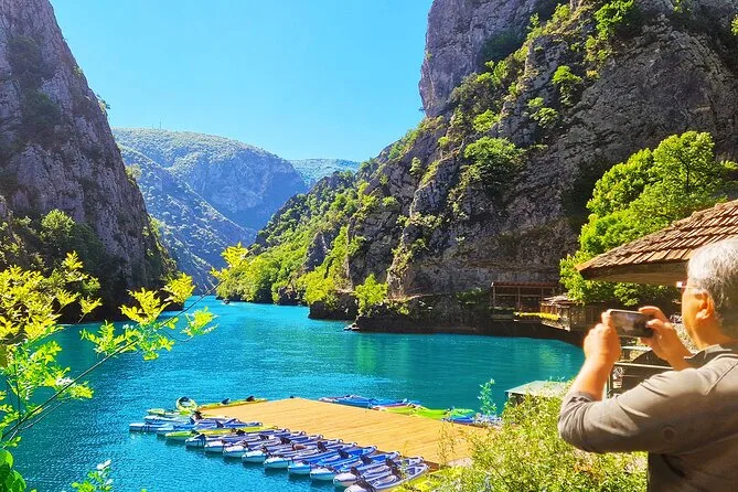Die Kirche des Heiligen Panteleimon war unser nächster Stopp – klein, fast versteckt hinter Bäumen, aber drinnen leuchten die alten Fresken in kräftigen Farben. Elena erzählte von dem Schutzpatron der Ärzte; aus irgendeinem Grund gefiel mir das besonders. Dann ging es weiter zum Matka Canyon, etwa 30 Minuten von der Stadt entfernt, der sich wie eine andere Welt anfühlt. Die Felswände schließen sich eng, alles riecht feucht und grün. Einige machten eine Bootstour zur Vrelo-Höhle (ich habe sie ausgelassen, um einfach am Wasser zu sitzen), aber ihr Lachen hallte über den See zurück.