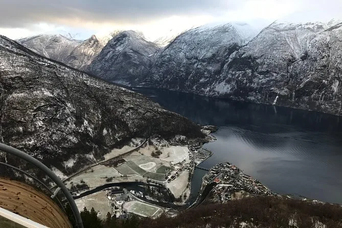 Flåm selbst ist klein, aber lebendig – wir hatten Zeit zum Mittagessen (ich entschied mich für die Fischsuppe, die jeder empfohlen hatte). Dort trifft man Wanderer, Radfahrer und ältere Paare, die einfach still das Kommen und Gehen der Boote beobachten. Danach schlängelten wir uns den Berg hinauf zum Stegastein Aussichtspunkt. Die Straße ist eng und schmiegt sich so nah an den Berg, dass man bei jeder Kurve kurz den Atem anhält. Oben steht eine Plattform, die 30 Meter über den Abgrund hinausragt – 650 Meter über dem Fjord. Alle wurden still, als sie darauf traten. Selbst Sindre grinste nur und ließ uns den Moment genießen.