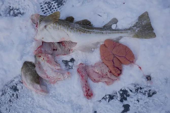 Ich hatte vorher noch nie Eisangeln ausprobiert. Es ist halb Geduld, halb Durchhaltevermögen. Die kleinen Löcher, die wir ins Eis bohrten, dampften leicht und ich roch eine frische, mineralische Note, die von unten hochstieg. Als meine Angel zuckte, wollte ich sie fast fallen lassen – Erik lachte und meinte, das sei wohl nur Tang. Aber keine zehn Minuten später hatte ich tatsächlich einen Fisch an der Leine. Erik zeigte mir, wie man ihn direkt auf dem Eis ausnimmt – gar nicht so eklig, wie ich dachte. Seine Hände waren flink und sicher, auch wenn meine vor Kälte fast taub waren.